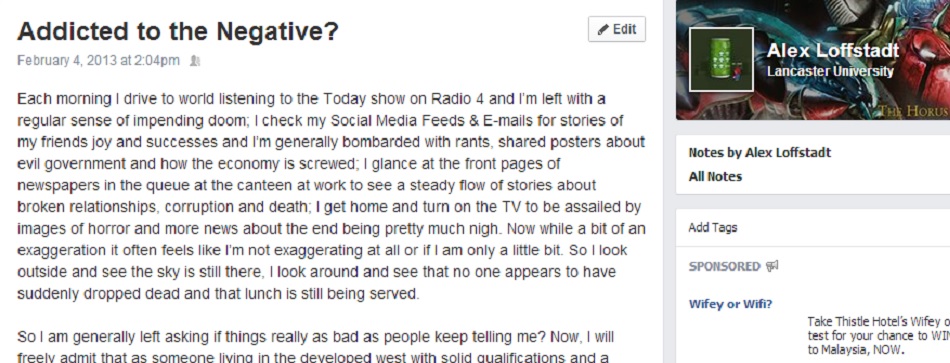 Each morning I drive to world listening to the Today show on Radio 4 and I’m left with a regular sense of impending doom; I check my Social Media Feeds & E-mails for stories of my friends joy and successes and I’m generally bombarded with rants, shared posters about evil government and how the economy is screwed; I glance at the front pages of newspapers in the queue at the canteen at work to see a steady flow of stories about broken relationships, corruption and death; I get home and turn on the TV to be assailed by images of horror and more news about the end being pretty much nigh. Now while a bit of an exaggeration it often feels like I’m not exaggerating at all or if I am only a little bit. So I look outside and see the sky is still there, I look around and see that no one appears to have suddenly dropped dead and that lunch is still being served.